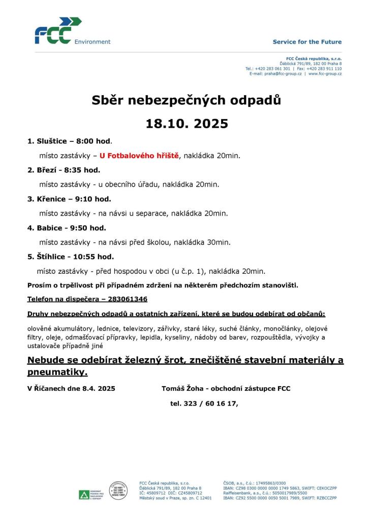 Druhy nebezpečných odpadů a ostatních zařízení, které se budou odebírat od občanů: olověné akumulátory, lednice, televizory, zářivky, staré léky, suché články, monočlánky, olejové filtry, oleje, odmašťovací přípravky, lepidla, kyseliny, nádoby od barev, rozpouštědla a jiná.